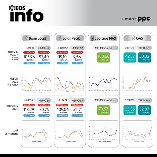 Просечната цена на струјата на HUPX берзата за 13 март 2026 изнесува 105,96 евра за мегават час, на МЕМО 97,40 евра за мегават час, соопшти Energy […]