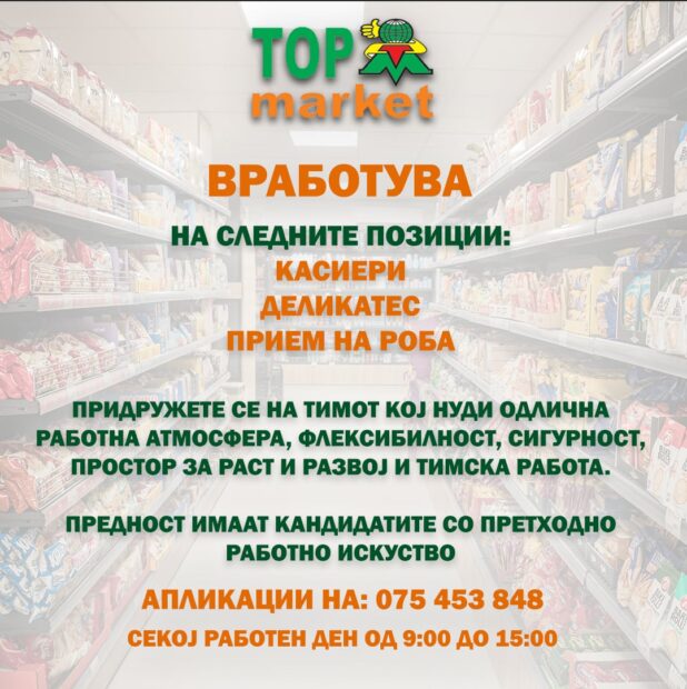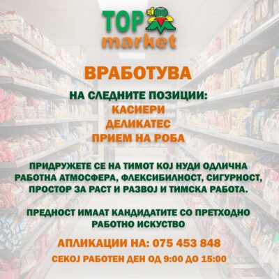 Топ Маркети вработува касиери, деликатес работници и работници за прием на стока во Охрид