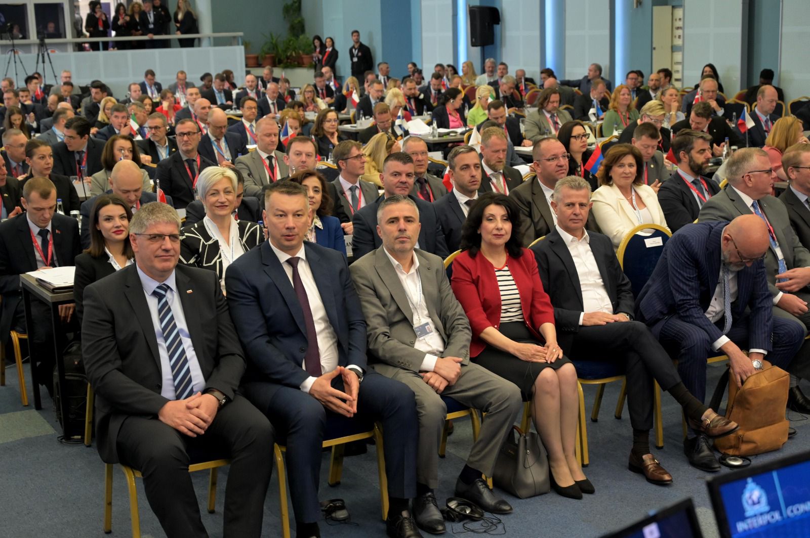 „Лидерството на Европскиот континент на терен може да се види преку силните механизми за споделување информации, раната адаптација на технологија и ефективни прекугранични операции. Регионот беше клучен играч во успехот на ИНТЕРПОЛ во текот на изминатите 100 години. И покрај оперативните успеси, постојат многу реални закани долж хоризонтот. Убиствата со умисла во ЕУ повторно се во пораст, по периодот на опаѓање. Новата генерација на сајбер-закани е присутна. И секако, влијанието на условите на конфликтот и нестабилната економија ширум светот се пространуваат и во Европа. Денес сме тука поради една причина: да изградиме побезбеден свет. Ова ќе го направиме преку споделување на увиди од терен, слушање на технички експерти и градење партнерства кои ќе поттикнат зајакнати работни односи во следните неколку дена. Денес ќе се фокусирам на две клучни области: Прво, клучната улога на Европа во борбата против постојните и новите облици на криминал и второ, важноста на споделување информации и соработка низ регионот и светот. Денес, Европа стои пред предизвикот на широк спектар на криминални дела. Организираниот криминал е главната грижа. А различни форми на трговија со луѓе, тероризам и сајбер криминал се исто така во пораст“, рече претседателот на ИНТЕРПОЛ Ахмед Насер Ал-Раиси.