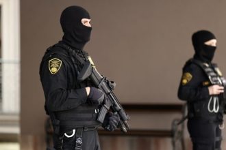 Пред оваа зграда, односно самиот влез во неа, стојат двајца припадници на специјалната единица на косовската полиција.