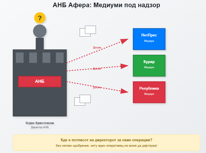 Македонската јавност повторно се соочува со сериозни обвинувања за злоупотреба на безбедносните служби и прислушување на медиуми. Најновите спинувани информации укажуваат дека три значајни медиумски куќи – НетПрес, Курир и Република – биле предмет на тајни истраги од страна на Агенцијата за национална безбедност (АНБ) и Финансиското разузнување. Овие наводи отвораат суштествени прашања за слободата на медиумите, владеењето на правото и можната политизација на безбедносните служби.