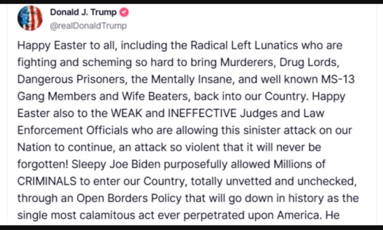 Американскиот претседател, исто така, им посака среќен Велигден на „неефикасните судии и службениците за спроведување на законот, кои дозволуваат овој злобен напад врз нашата земја да продолжи, напад толку насилен што никогаш нема да биде заборавен“.