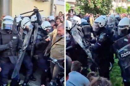 Пред Факултетот за спорт и физичко образование во Нови Сад, чиј влез беше блокиран од граѓани и студенти утрово, се…