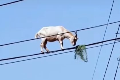 Вирално стана видео од коза како мирно „грицка“ на жици од далноводи неколку метри над земјата. Сите само се прашуваат:…