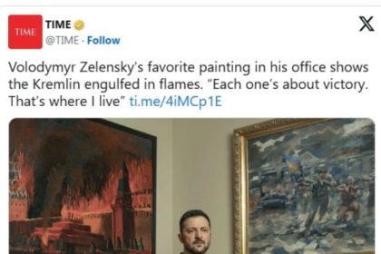 Фотографијата на украинскиот претседател Володимир Зеленски како позира пред слика на која е прикажан Кремљ како гори објавена од магазинот…
