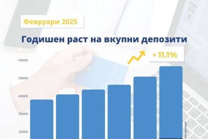 Анализирано на годишно ниво, вкупните депозити остварија раст од 11,1%, во поголем дел поради растот на депозитите на „домаќинствата“, при…