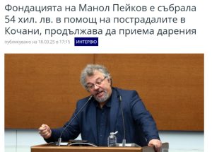 trending_flat Балкан Бугарскиот пратеник Манол Пејков од 16 март до 19 март преку хуманитарна кампања на својата фондација „Манол Пејков и пријатели“ собрал околу 54.000 лева, односно околу 27.000 евра Lorita March 20, 2025