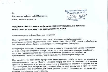 Родителите на починатите деца во пожарот во дискотеката „Пулс“ во Кочани се сретнале со премиерот Христијан Мицкоски на 7 јули.…