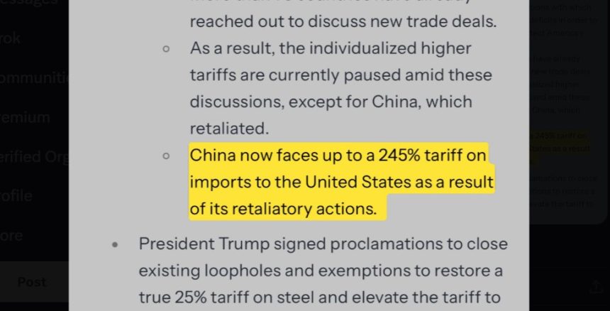 „Никој не се „симнува од јадица“ поради неправедните трговски биланси и немонетарни царински бариери, кои другите земји ги користеа против нас, особено не Кина, која, далеку, ни се однесува најлошо!“, напиша Трамп на својата платформа „Truth Social“ на 13 април.