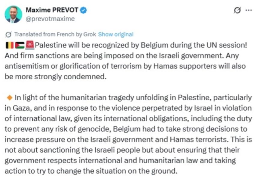 „Палестина ќе биде признаена од Белгија на седницата на ОН! Против израелската влада ќе бидат воведени силни санкции“, напиша Прево на социјалната мрежа Икс.