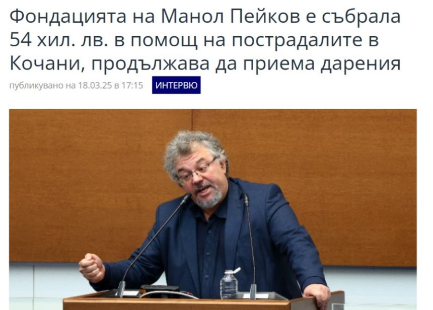 Бугарскиот пратеник Манол Пејков од 16 март до 19 март преку хуманитарна кампања на својата фондација „Манол Пејков и пријатели“ собрал околу 54.000 лева, односно околу 27.000 евра, објави БНР.