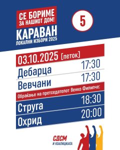 trending_flat ЛОКАЛНИ ИЗБОРИ 2025 Караванот на СДСМ “Се бориме за нашиот дом” денеска ќе биде со граѓаните на Дебарца, Вевчани, Струга и Охрид Lorita October 3, 2025