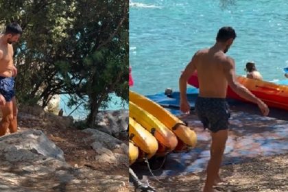 Српскиот тениски ас Новак Ѓоковиќ внимава да не се лизне од карпи, сугерира снимка од плажа на Мљет, остров во…
