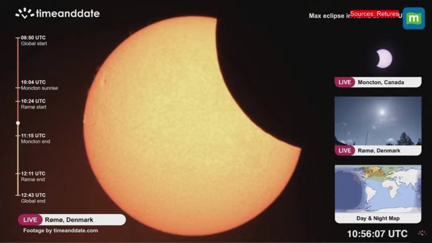 Денеска имаше делумно затемнување на Сонцето кое беше видливо од делови од Европа, Северна Америка и од Африка.