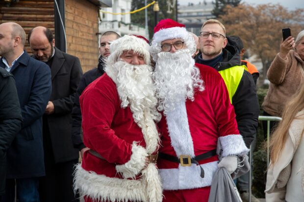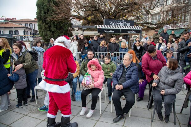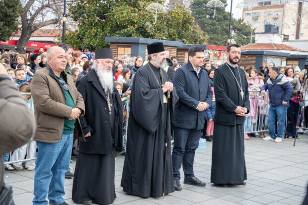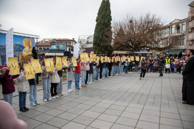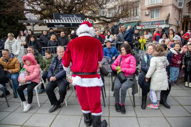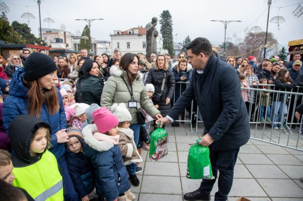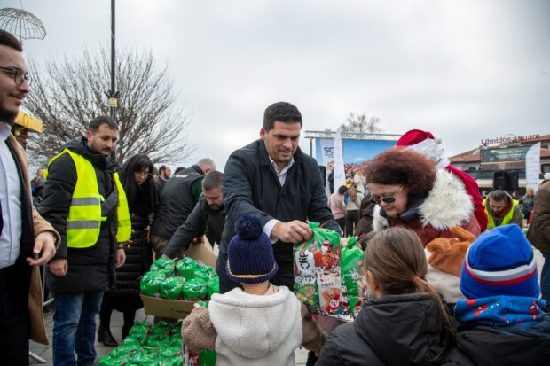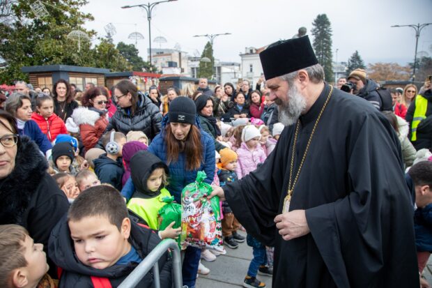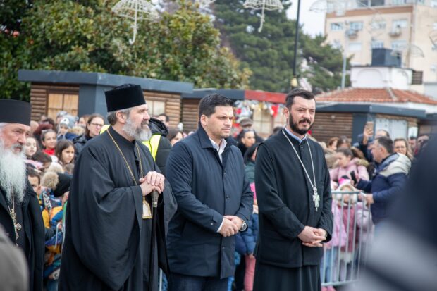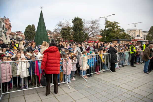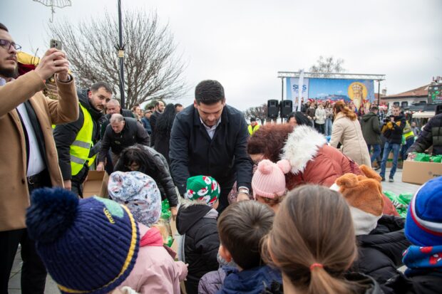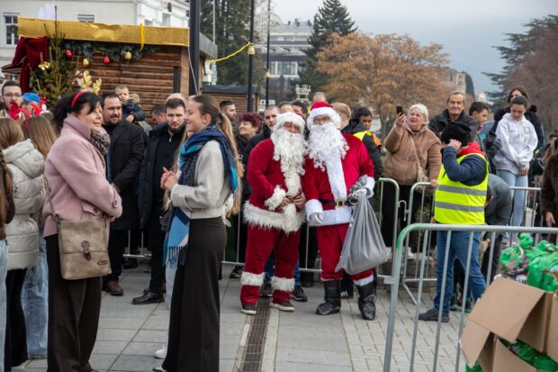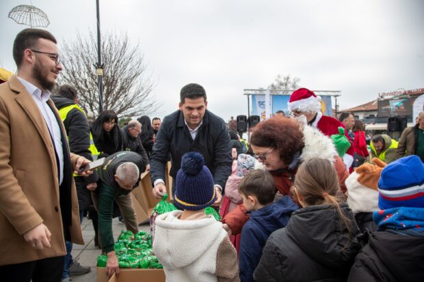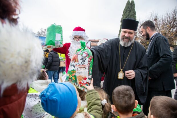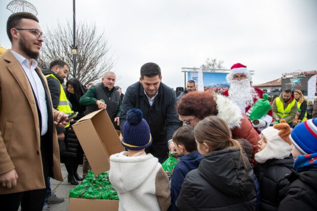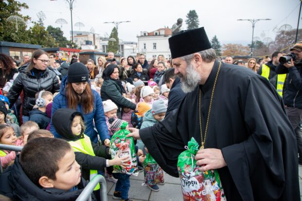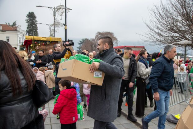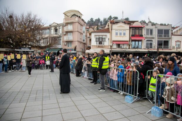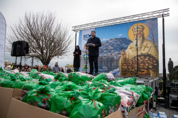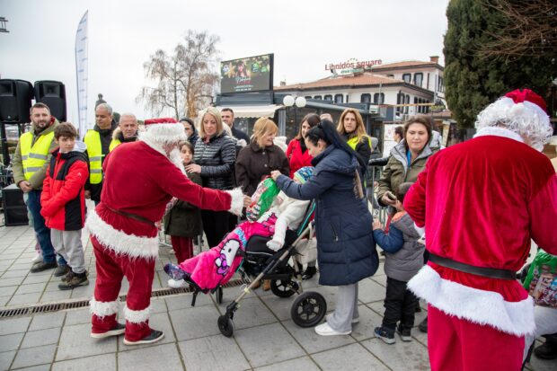 Високите гости се обратија до граѓаните, а градоначалникот Пецаков и Митрополит Ѓорѓи започнаа со поделба на новогодишни пакетчиња на децата кои организирано од школи и градинки од Општина Охрид дојдоа на охридскиот плоштад. Вкупно беа поделени над 3.000 новогодишни пакетчиња.