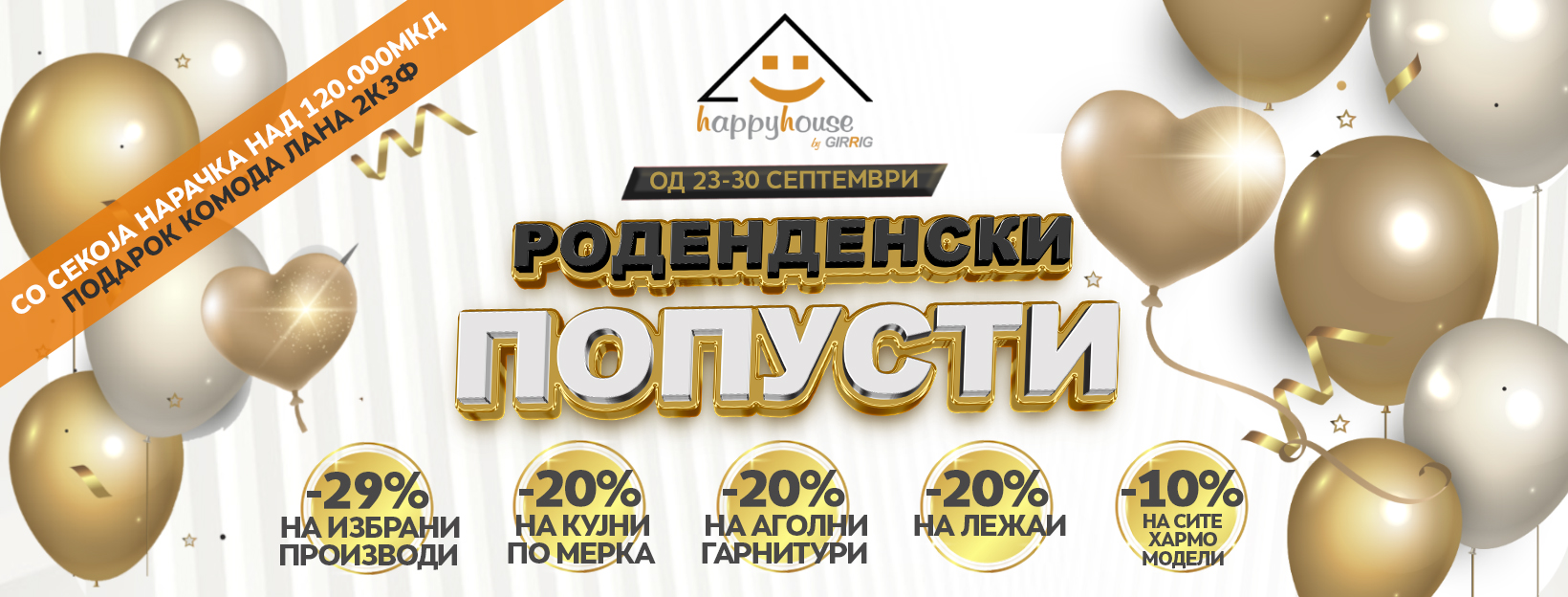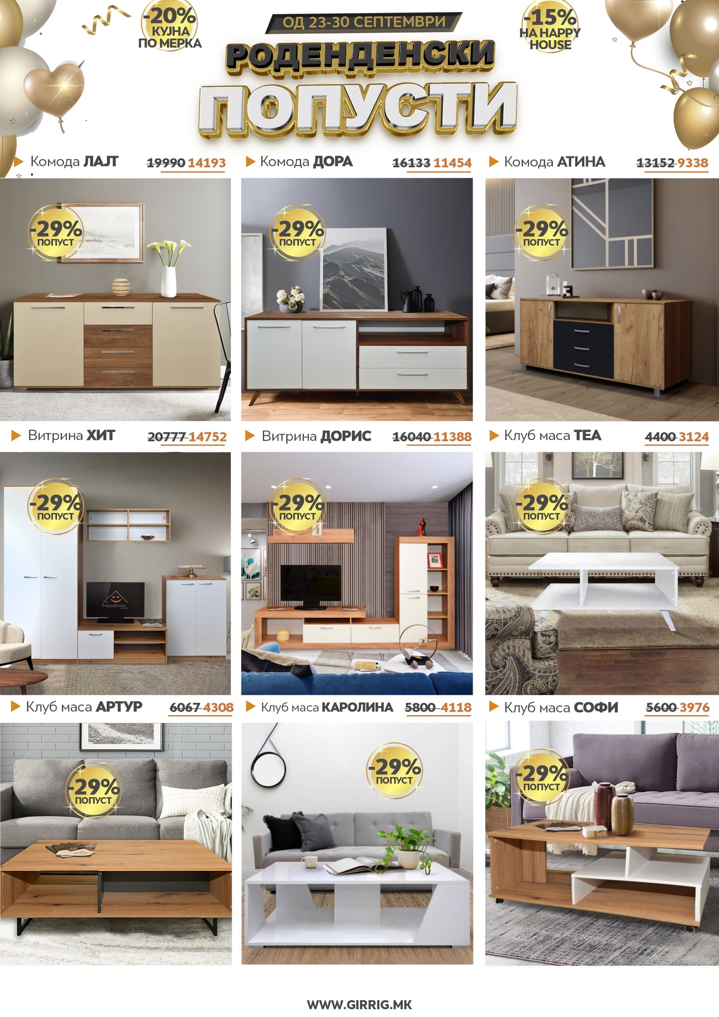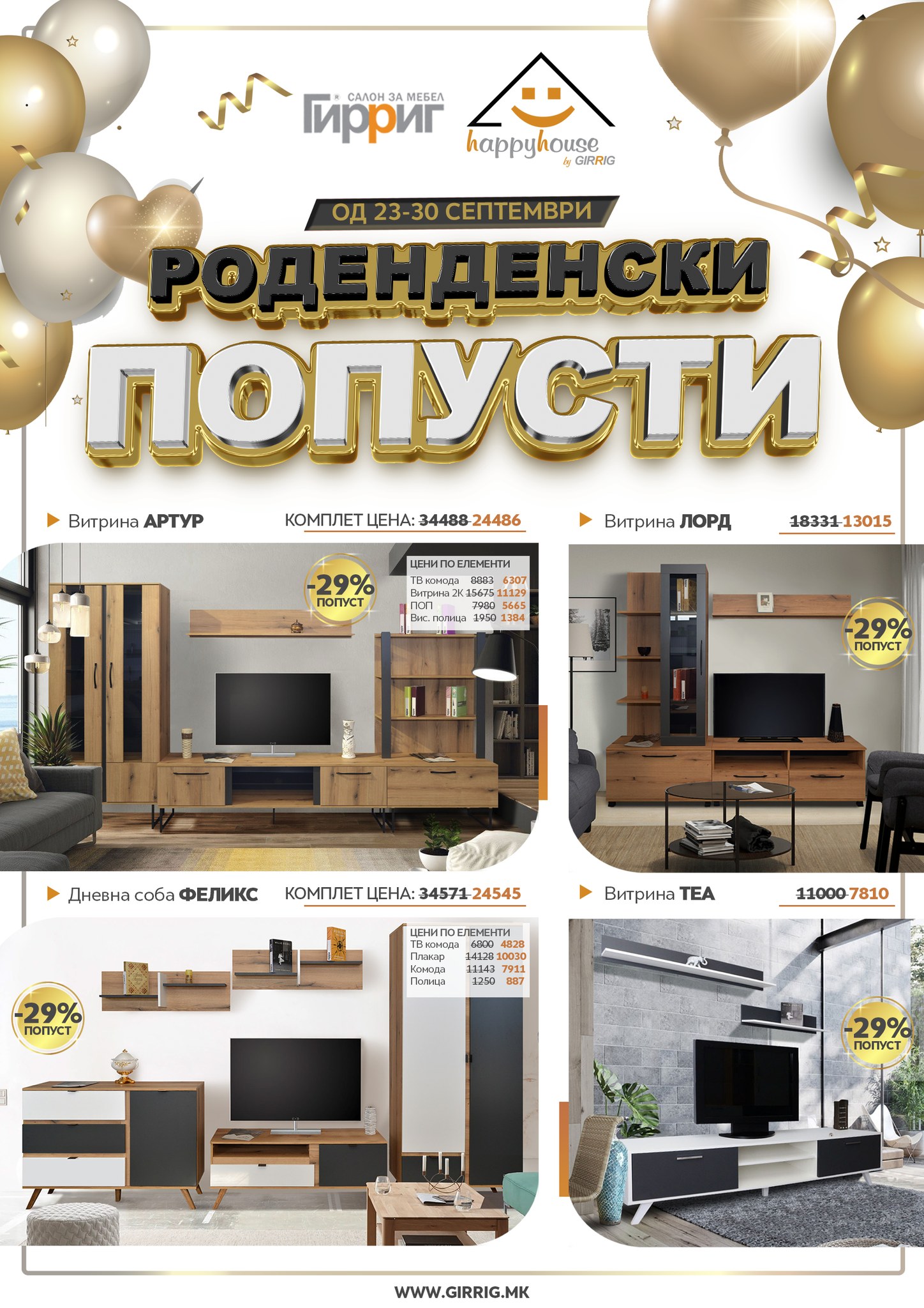 Време е за роденденски попусти во знак на нашиот 29-ти роденден. 🎈 Речиси три децении вие ни ја давате вашата доверба, а ние најквалитетното од мебелот и заедно создаваме среќа во вашите домови! За вас подготвивме цела недела на големи попусти и подароци! Кујни по мерка, цел асортиман на Happy House, гарнитури, фотелји, трпезариски сетови, клуб маси, плакари. 👍