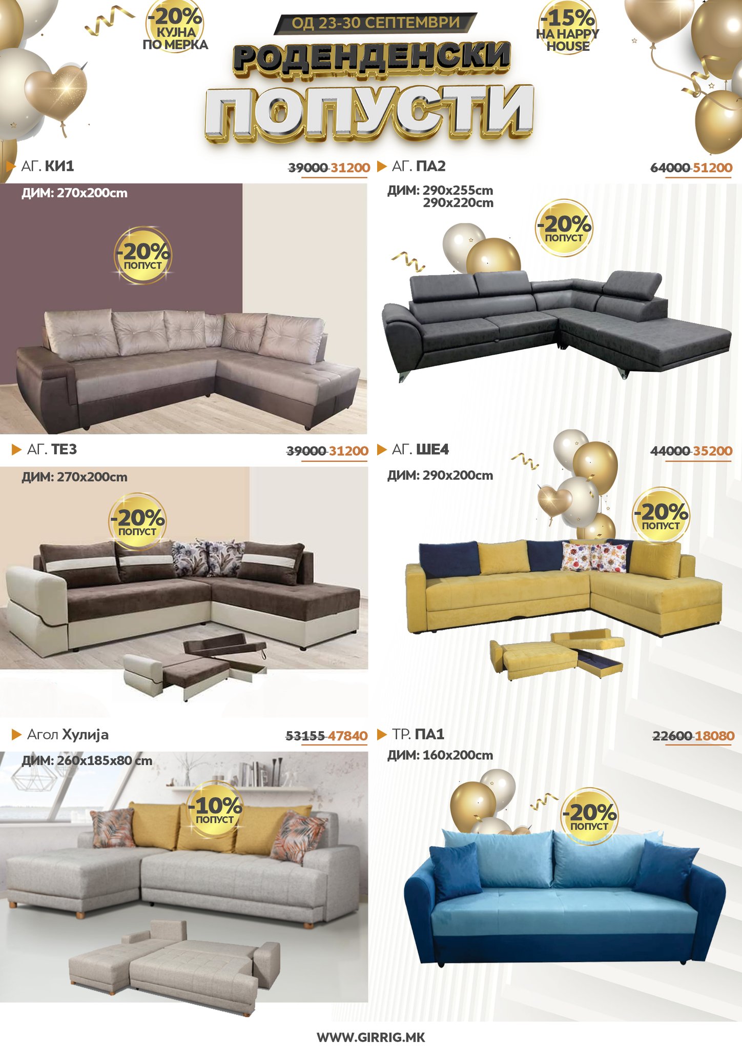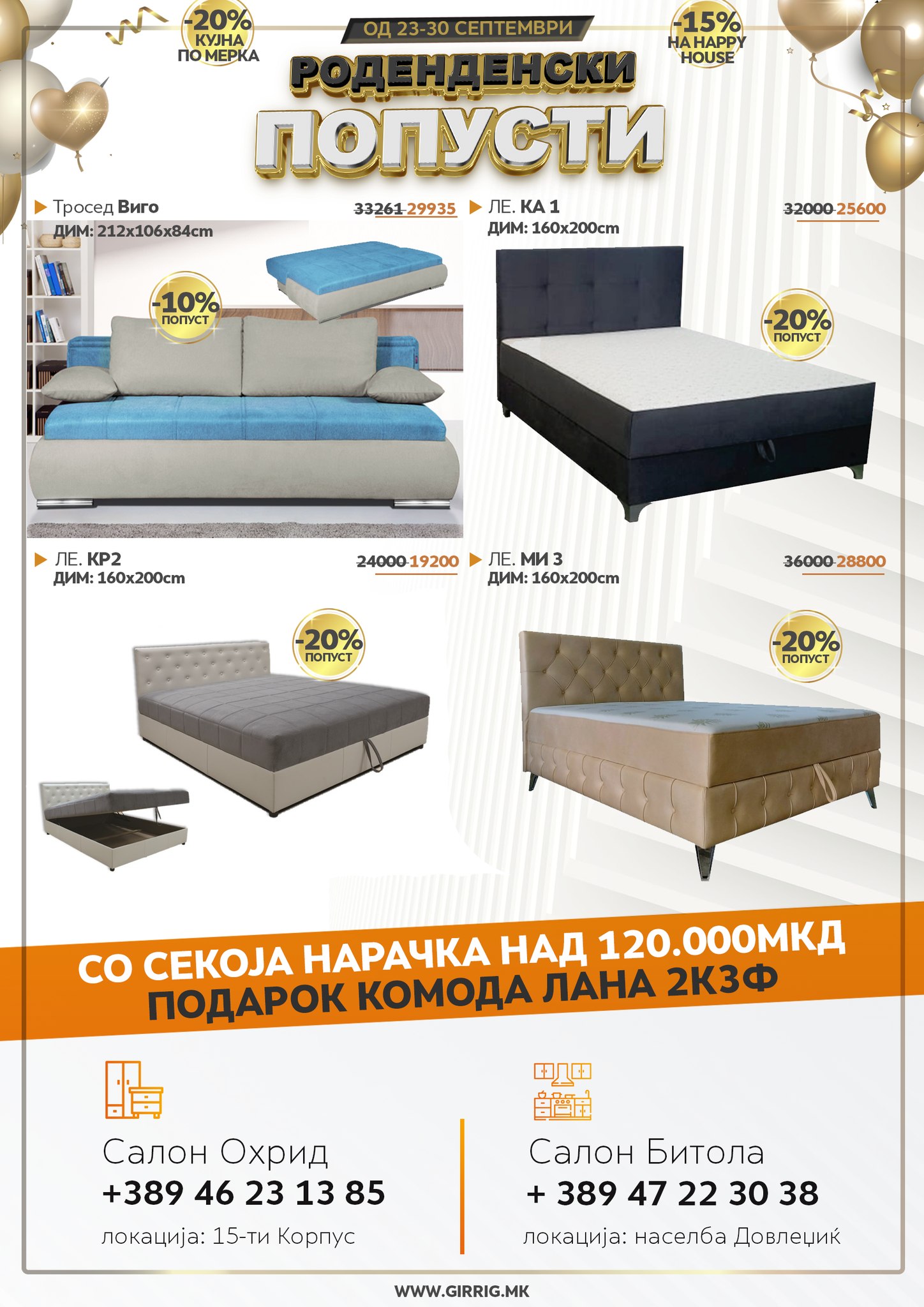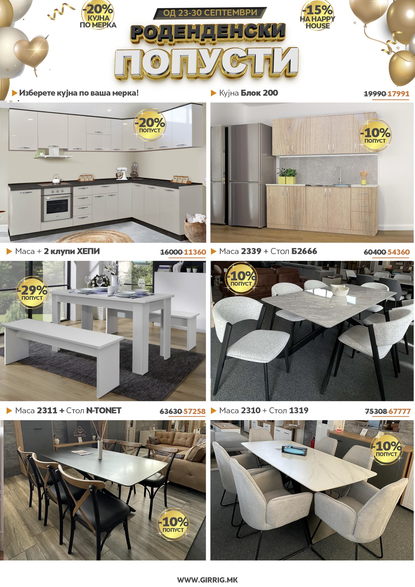 Време е за роденденски попусти во знак на нашиот 29-ти роденден. 🎈 Речиси три децении вие ни ја давате вашата доверба, а ние најквалитетното од мебелот и заедно создаваме среќа во вашите домови! За вас подготвивме цела недела на големи попусти и подароци! Кујни по мерка, цел асортиман на Happy House, гарнитури, фотелји, трпезариски сетови, клуб маси, плакари. 👍