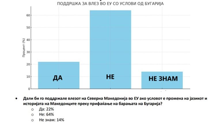 На прашањето за поддршка за влез во ЕУ со услови од Бугарија како што се промена на јазик и историја, 64% од испитаниците рекле дека се против, а само 22% поддржуваат.