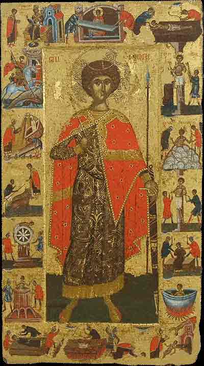 Според едни извори Георгиј Победоносец е роден во Кападокија, во Мала Азија[1], според други во градот Бејрут, а според трети во Лида Палестинска[2], околу 270 година. Неговите родители биле богати, но чесни и побожни. Рано останал без татко, по што мајка му заедно со него се преселила во Палестина од каде што потекнувала и каде што поседувала голем имот. Тамо го минал детството посетувајќи ги местата каде што Исус го проповедал своето учење. Тука се стекнал и со образование. Бил висок, убав и храбар поради што добил висока служба во војската. Уште на 20 годишна возраст добил висок чин – воен трибун, а подоцна императорот Диоклецијан го поставил за член на државниот совет што исто така значело големо признание. Но тогаш императорот не знаел каква религија исповедува младиот воен старешина. По смртта на мајка му тој станал наследник на големиот имот, но набргу ги ослободил робовите, а имотот го разделил на сиромасите. Со тоа како да се подготвувал за јавно проповедање на својата вера. Кога Диоклецијан започнал жесток прогон на христијаните, Георгиј му се спротивставил, ги зел во заштита неправедно прогонетите и самиот признал дека верува во Господ Исус Христос. Тоа многу го изнедило и го разочарало императорот кој бесен на својот војник наредил веднаш да биде затворен и подложен на најсурови мачења, со единствена цел да се откаже од својата вера и да му се врати на идолопоклонството. Легендата вели дека ноќта пред да оди кај царот му се јавил Исус, на главата му ставил победнички венец и го охрабрил да издржи во своето верување ветувајќи му дека наскоро ќе го земе кај себе. Кога Св. Георгиј на императорот му рекол дека не е само негов туку и Исусов војник бил подложен на најсурови мачења. Најпрвин бил положен на грб, нозете му биле ставени во клада, а врз него бил турнат голем камен. Кога тоа не го поколебало, го ставиле врз тркало под кое имало штици со шајки кои му го парале телото. Кога и тоа не повлијаело го тепале со воловски жили, го ставиле во дупка полна со негасена вар и турале вода, му облекле усвитена облека, три дена го држеле закопан во земјата само со главата над земја. Најпосле му дале да испие отров, а кога и тој не дејствувал му ја отсекле главата. Гледајќи ги овие страдања на св. Георгиј особено брзото исцелување на раните и отпорноста на отровот, жената на Диоклецијан, Александра јавно изјавила дека го прифаќа христијанството поради што била осудена на смрт. Одејќи кон губилиштето таа му се помолила на Господа и веднаш му ја предала својата душа..