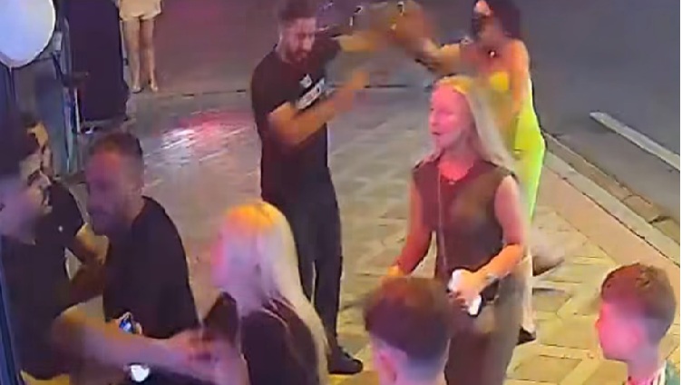 Снимката прикажува група, вклучувајќи жени, како се удирани со тупаници и клоцани од персоналот во ресторанот „Мед Бојс“ во Мармарис, Турција, на 2 јуни.