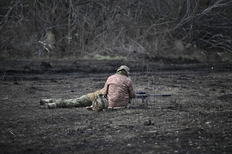 Soldiers of the 59th brigade of Ukrainian Armed Forces conduct a sniper training at an undisclosed location in the Donetsk region, on January 22, 2025, amid the Russian invasion of Ukraine. (Photo by Genya SAVILOV / AFP)