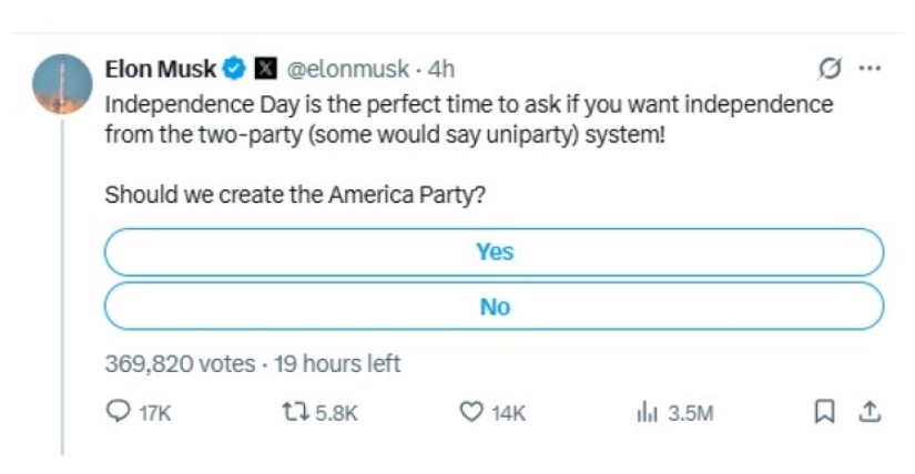 „Денот на независноста е совршено време да се прашаме дали сакате независност од двопартискиот (некои би рекле еднопартиски) систем! Дали да ја создадеме Американската партија?”, напиша тој, придружувајќи ја пораката со интерактивна анкета.