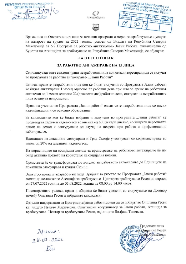 Јавен повик за работно ангажирање на 15 (петнаесет) лица
