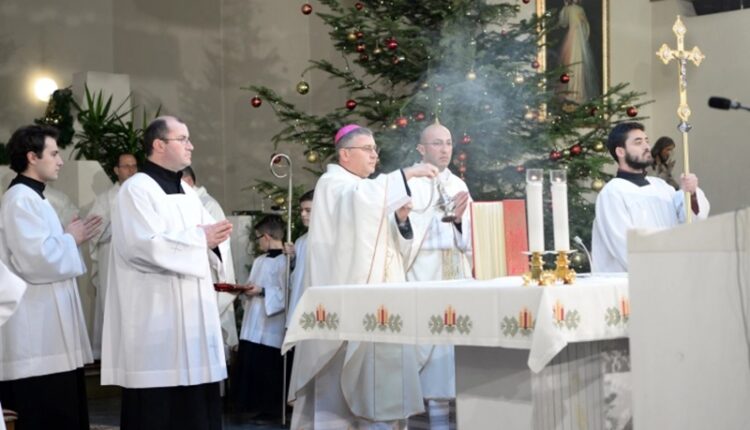 – Овие денови голема е радоста во срцата на христијаните токму поради празникот Рождество на нашиот Господ Исус Христос – Божиќ, со кој Бог стана човек и влезе во човечката историја за да го помири човекот со Бога. Затоа Божиќ е надеж за човештвото. Сигурен сум дека сите сакаме да се помириме со Бога и да црпиме благодати од заедништвото со Него. Но не е доволно да се помириме само со Бога, туку и со ближниот. Впрочем тоа е повикот на празникот Рождество Христово – Божиќ, тоа е повикот на Јубилејната година, која ја започнуваме, не случајно на Бадник, со отворањето на Светата врата во базиликата Свети Петар во Ватикан. А смислата на Јубилејната година е да продолжи во текот на целата година помирувањето на човекот со Бога и ближниот. И уште еднаш само потврдуваме, како Бог преку Црквата излева благодат врз благодат на човештвото, кое е тешко рането и крвави од војни, сиромаштво, глад, нерамномерна распределба на богатствата и ресурсите. И токму тоа му е потребно, односно помирување. Радоста и простувањето се неразделни – само кога ќе простиме, ќе ја почувствуваме вистинската слобода, радост и надеж, кои Христос со своето раѓање ги донесе во светот. Посакувам овој Божиќ и Јубилејната година да ни донесат изобилен Божји благослов и надеж во иднината, имајќи ја сигурноста дека за нас Бог стана човек и е со нас – Емануел. Христовото раѓање нека ни донесе мир и благослов во нашите домови и во нашите семејства! – рече бискупот скопски и епарх струмичко – скопски Киро Стојанов на полноќната божиќна литургија во Католичката црква „Пресвето Срце Исусово“ во Скопје.