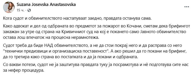 Најавениот заеднички брифинг на Основниот кривичен суд Скопје и Јавното обвинителство за предметот за трагичниот пожар во Кочани предизвика бурна реакција од адвокатката Сузана Јошевска-Анастасовска, која е дел од одбраната во случајот. Нејзината критика отвора фундаментално прашање за процесната правичност и улогата на судот во кривичната постапка.