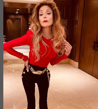 69-годишната Џексон сподели на Инстаграм фотографии од себеси, во црвен топ со долги ракави, црни панталони и златни потпетици со шпицест врв. Таа носи и дебел ремен со синџир и нараквица преку десниот зглоб.