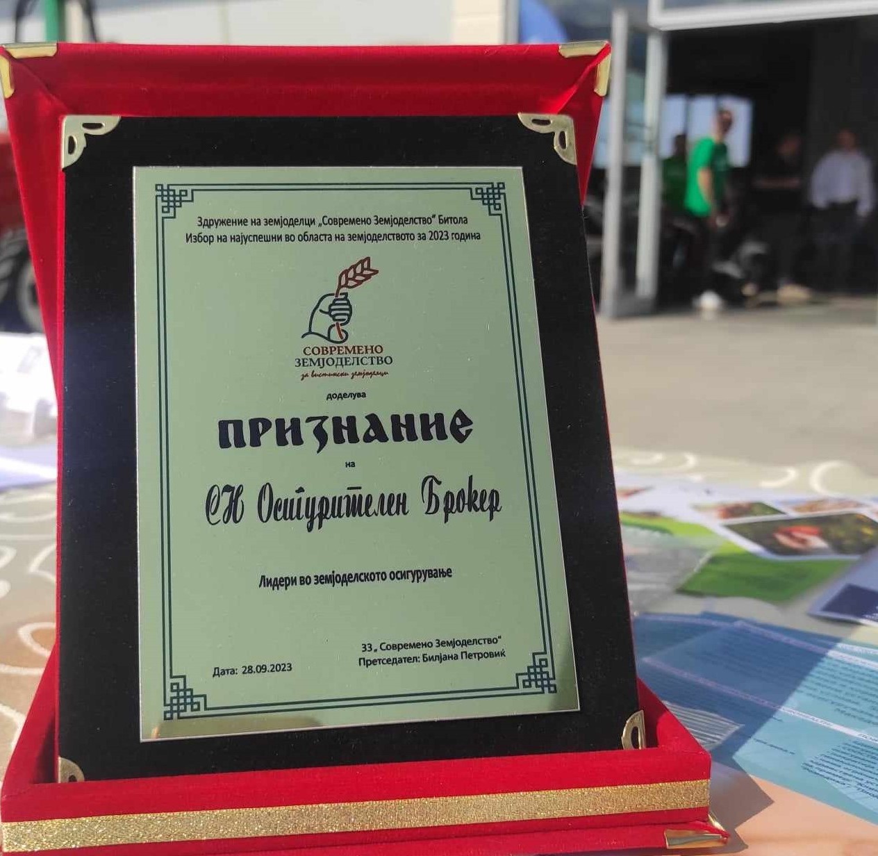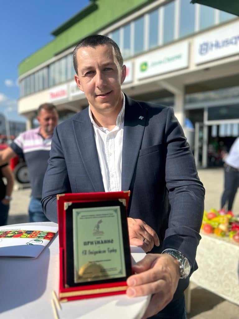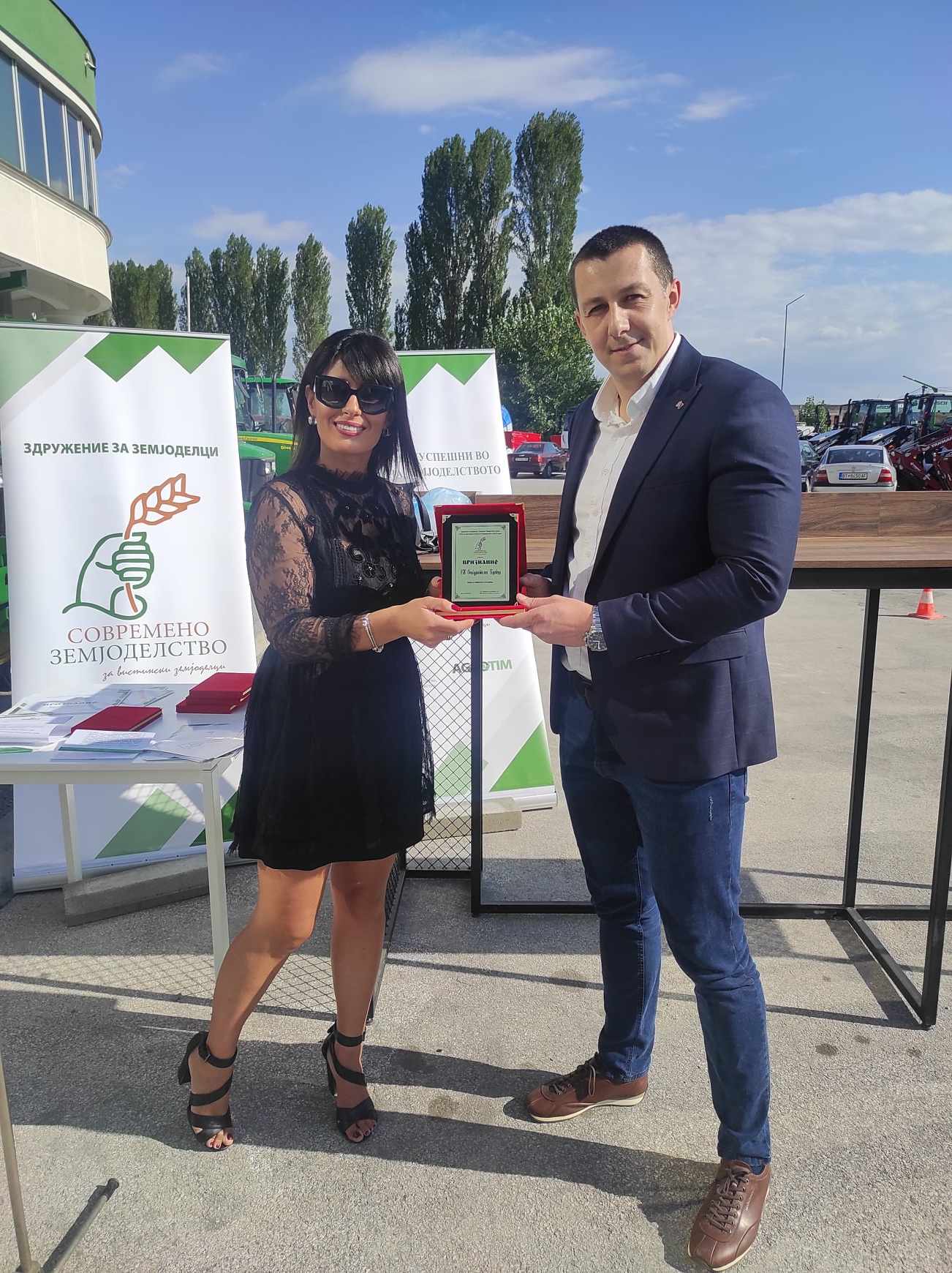 На церемонија на доделување на наградите во Битола, претседателката на „Современо земјоделство“, Билјана Петровиќ му го врачи признанието на Таше Наумовски – Раководител на експозитура во Ресен и виш соработник на сектор земјоделие во СН Осигурителен Брокер АД Битола.