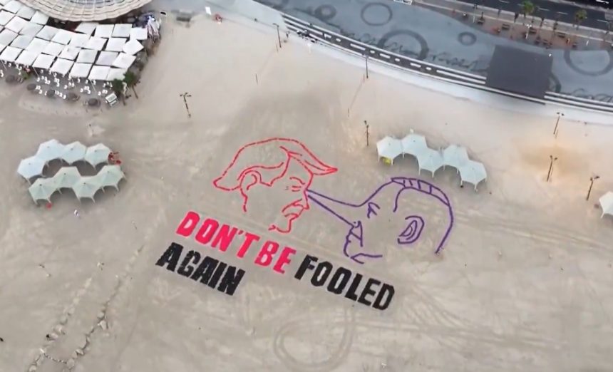 Плажата станала платно за политичка порака: Трамп и Нетанјаху лице в лице, а под нив натпис „Не дозволувајте пак да бидете изманипулирани“. Инсталацијата ја направиле активисти и семејства на израелски заложници. Нивната порака ја следела временската рамка на клучните состаноци и изјави.