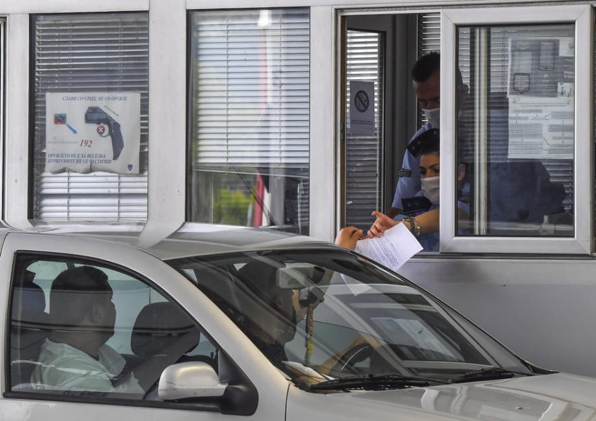 epa08490553 Police officer wearing protective mask takes documents from a passenger at the border crossing Tabanovce near Kumanovo, North Macedonia, 17 June 2020. North Macedonia?s Government has decided to open all border crossings starting on 17 June 2020. Passengers can cross the borders with condition to show a valid negative PCR test and go in 14 day mandatory self-isolation. Foreigners transiting the country for a period of maximum 5 hours can use all border crossings. The number of newly infected COVID-19 patients in the North Macedonia is still more than one hundred per day in last three weeks, which is a big number for the small Balkan country. EPA-EFE/GEORGI LICOVSKI