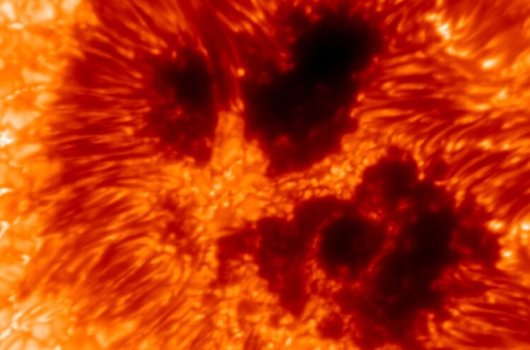 Деталната слика открива група сончеви дамки со големина на континент зад Земјата, лоцирани во близина на центарот на внатрешната атмосфера на сонцето.
