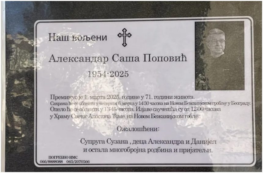 „Нашиот сакан Александар Саша Поповиќ почина на 1 март 2025 година на 71-годишна возраст. Погребот ќе се изврши во четврток во 14 часот и 30 минути на гробиштата Нови Бежаниј во Белград. Сочувство ќе се одржи од 12:00 часот во црквата Свети апостол Тома на гробиштата Нова Бежанија.