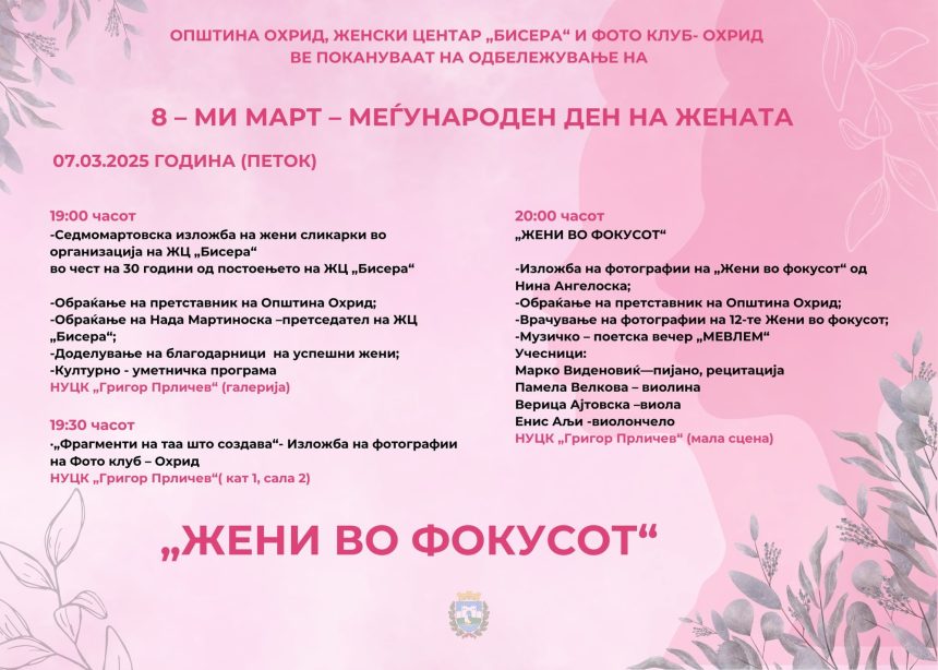 По повод 8-ми Март-Меѓународниот ден на жената, на малата сцена во Центарот за култура ,,Григор Прличев” на 07.03.2025 г. (петок) со почеток во 20:00 часот, Општинa Охрид организира музичо- поетска вечер ,,МЕВЛЕМ” во чии рамки ќе настапат: Марко Виденовиќ – пијано, рецитација; Памела Велкова-виолина; Верица Ајтовска – виола и Енис Аљи- виолончело.
