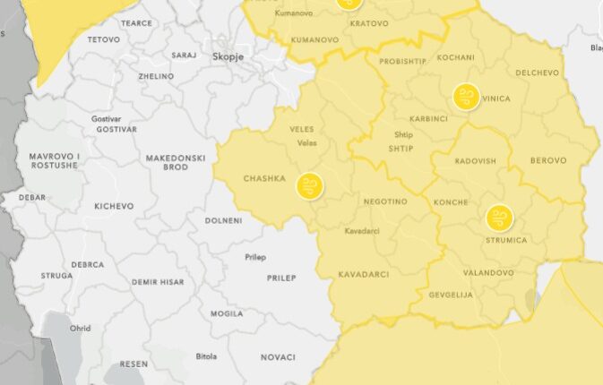 Жолтото предупредување се однесува на североисточниот, источниот и на југоисточниот дел од Македонија.