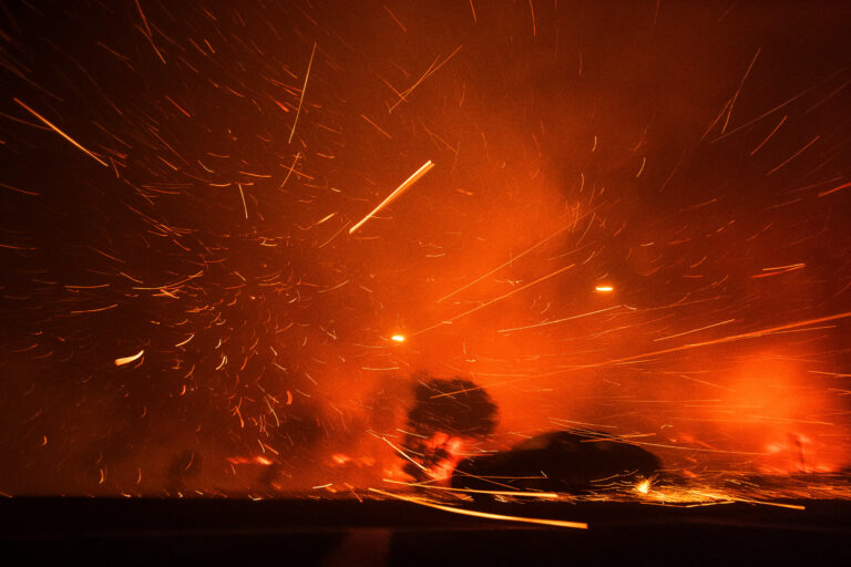 Сведоците пријавија голем број на куќи во пламен кои за малку ќе ги изгореле нивните автомобили додека бегале од ридовите на кањонот Топанга, бидејќи огнот се проширил од таму кон Тихиот Океан.