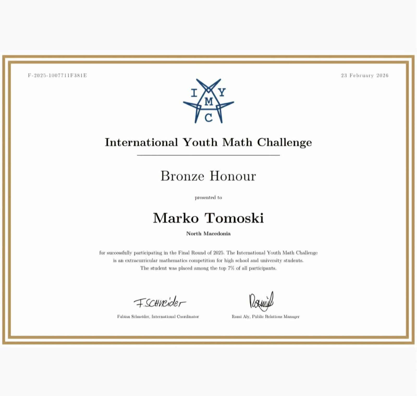 International Youth Math Challenge 2025 Ohrid Голем успех за Охрид и за Македонија – младиот охриѓанец Марко Томоски освои Bronze Honour( Бронзен медал) на престижниот International Youth Math Challenge 2025, натпреварувајќи се во категоријата до 16 години, иако има само 12 години.