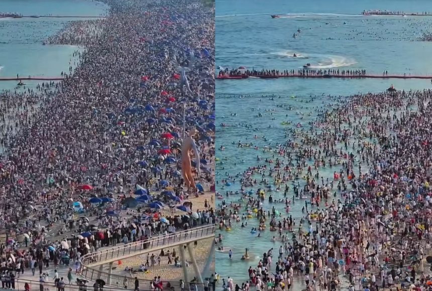 Песокот на плажата во Шен Жен во Кина не може да се види од бројните туристи кои како мравки за празниците доаѓаат и ја окупираат оваа позната туристичка локација. На ТикТок се појавија дузина снимки кои покажуваат како е да се летува во ова одморалиште.