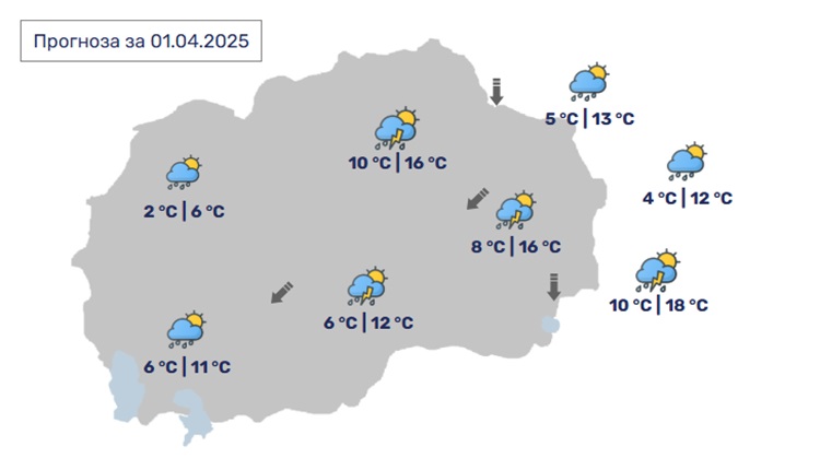 Во Скопје, времето ќе биде променливо облачно со повремен дожд и со слаб до умерен ветер од северен правец. Попладне и во вечерните часови ќе биде нестабилно со пороен дожд и грмежи, а во делови од котлината ќе има услови за краткотрајно невреме со пообилен пороен дожд и засилен ветер.