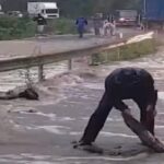 На видеата на социјалните мрежи се гледаат улични порои, каде се снимени малку неверојатни сцени во кои водата носи гранки на пат кон брегот.