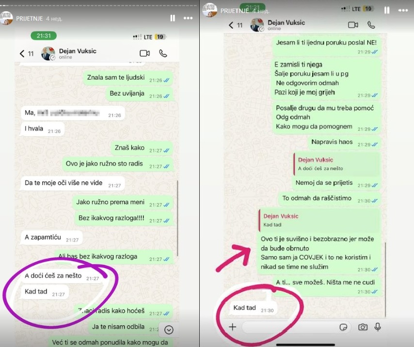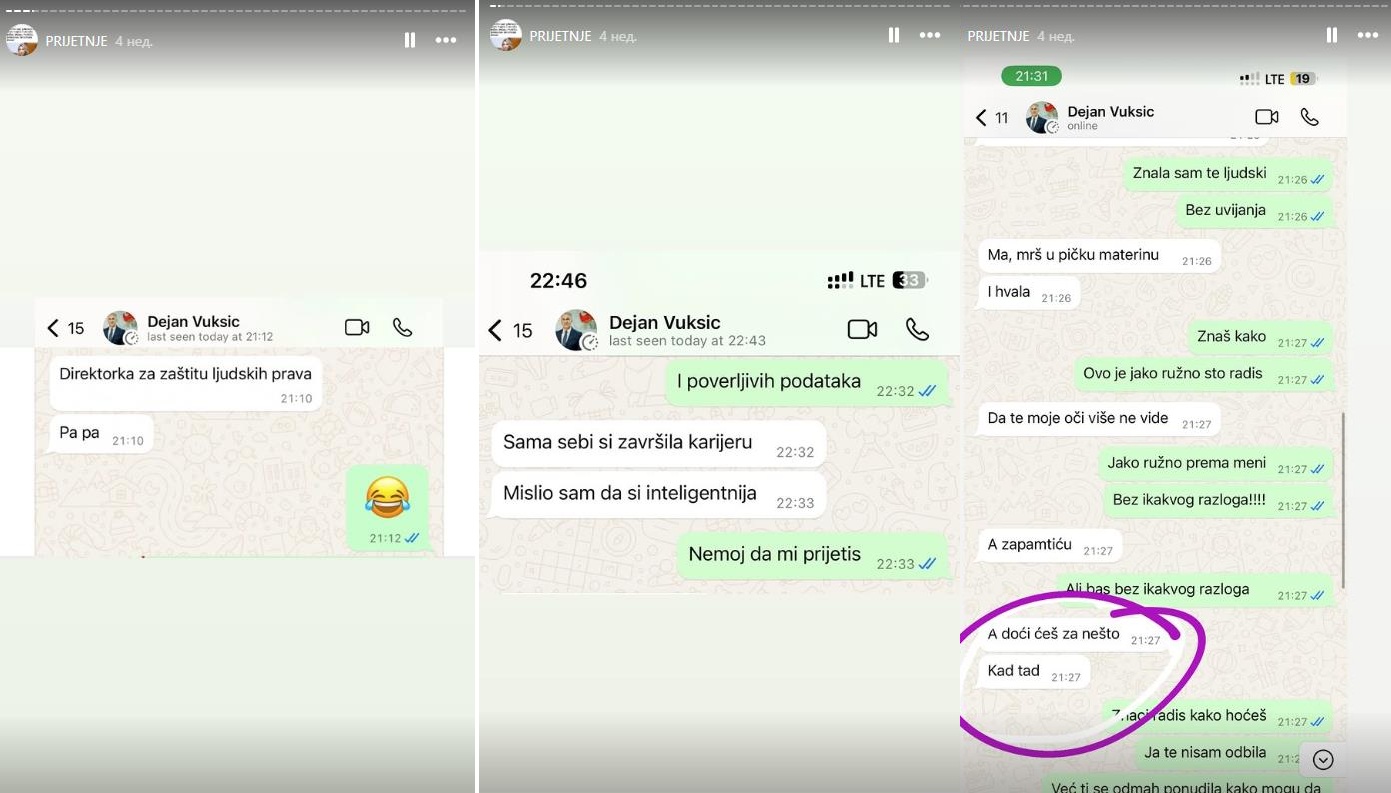 „Јас не те одбив“, „Да не те видат моите очи“, „Сама си ја заврши кариерата, те мислев за поинтелигентна“, „Ќе дојдеш за нешто, кога-тогаш“, гласат дел од пораките.