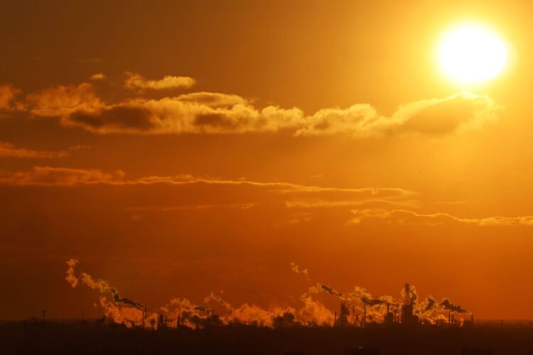 Abgase und Wolken über einer großen Industrieanlage nahe Detroits im gelborangen Gegenlicht der untergehende Sonne, Michigan, USA, Umweltschutz, Klimawandel, Luftverschmutzung, *** Exhaust fumes and clouds over a large industrial plant near Detroit in the yellow-orange backlight of the setting sun, Michigan, USA, environmental protection, climate change, air pollution,,Image: 954081911, License: Rights-managed, Restrictions: imago is entitled to issue a simple usage license at the time of provision. Personality and trademark rights as well as copyright laws regarding art-works shown must be observed. Commercial use at your own risk., Model Release: no