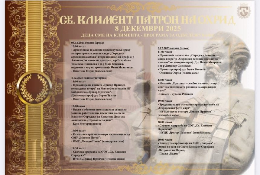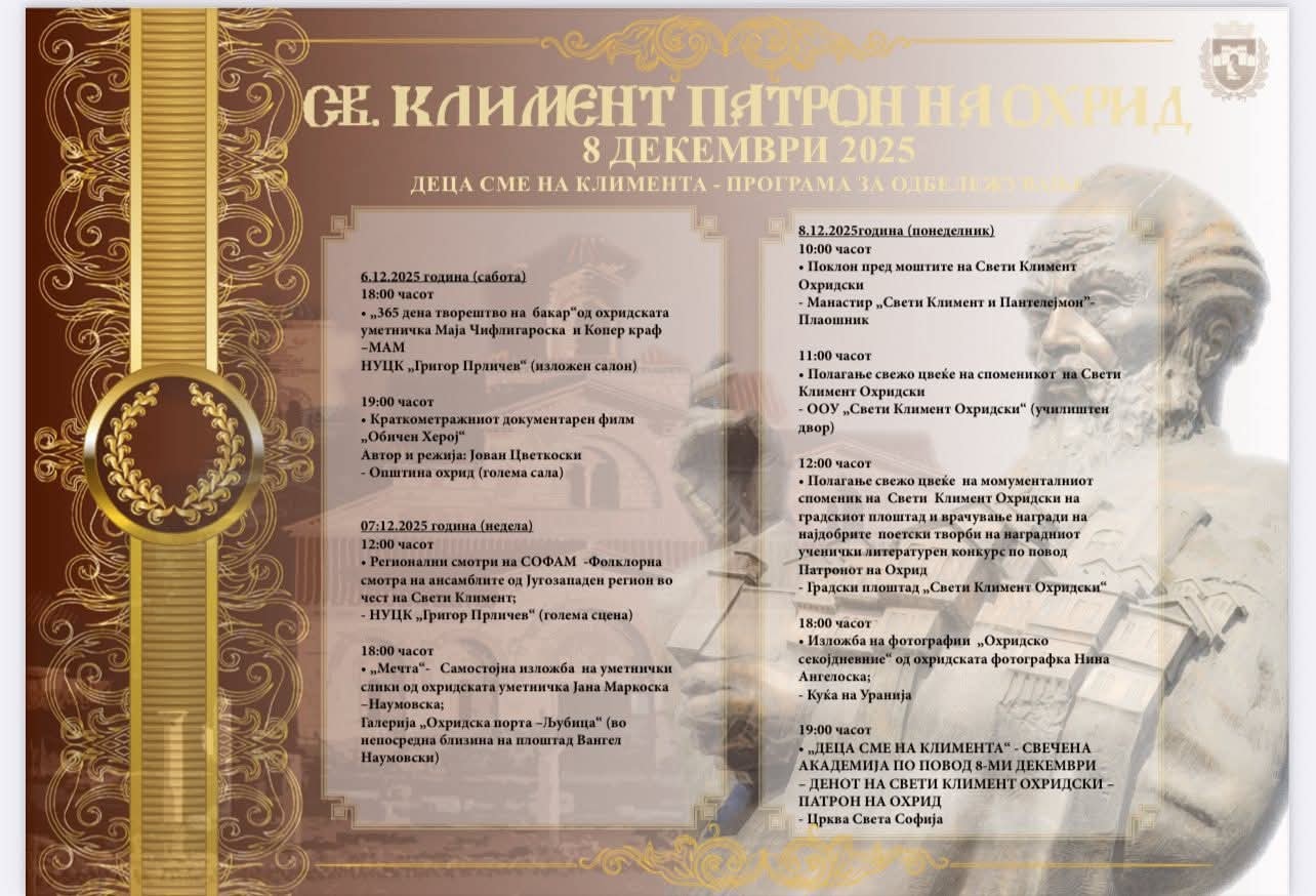 ‎Во духот на традицијата, заедништвото и почитта кон Светиклиментовото дело подготвивме богата, шестдневна програма која започнува од утре 03.12.2025 година.