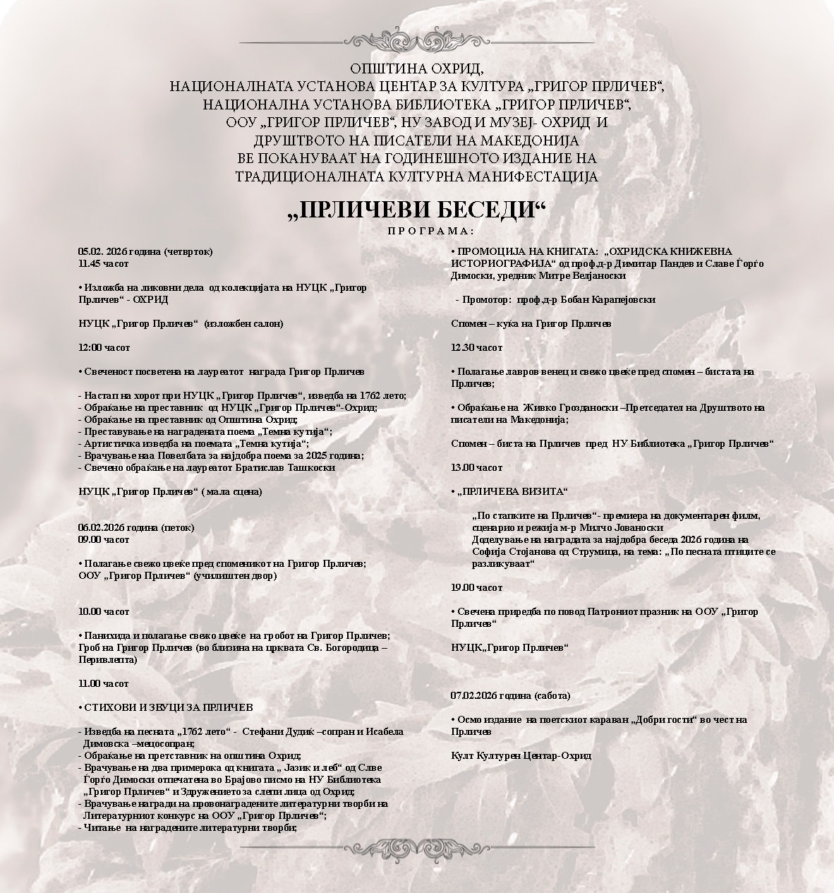 Нашиот великан Григор Прличев заслужува огромна почит и трајно вреднување. Водени од таа обврска и оваа година подготвивме богата програма во рамки на традиоционалната манифестација “Прличеви Беседи”.