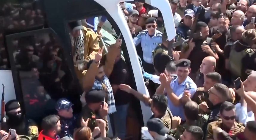 Некои покажаа знак на победа со рацете, а повеќето со насмевки на лицата излегоа од автобусот што ги донесе од израелски затвор до културниот центар во градот каде што се наоѓа Палестинската самоуправа.