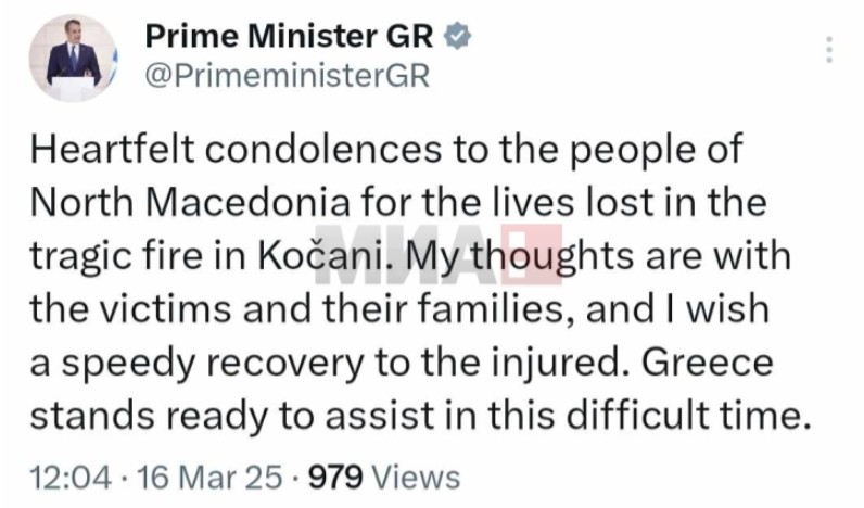 „Искрено сочувство до народот на Северна Македонија за загубените животи во трагичниот пожар во Кочани. Моите мисли се со жртвите и нивните семејства, а на повредените им посакувам брзо закрепнување. Грција е подготвена да помогне во ова тешко време“, напиша Мицотакис.