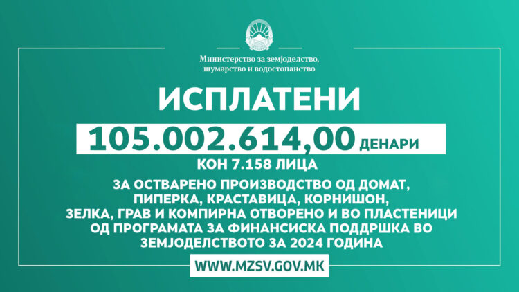 „Денеска се реализираше исплатата на подмерката за дополнителни директни плаќања од подмерката за остварено производство од домат, пиперка, краставица, корнишон, зелка, грав и компир на отворено и во пластеници од Програмата за финансиска поддршка во земјоделството за 2024 година. Корисници на оваа подмерка се земјоделските стопанства кои имаат засадени површини со домат, пиперка, краставица, корнишон, зелка, грав и компир, а оствареното производство е предадено на регистриран откупувач, вклучително и произведените градинарски култури за потребите на сопствениот преработувачки капацитет или е користено за домашни потреби или е продадено на пазар“, соопшти Министерството.
