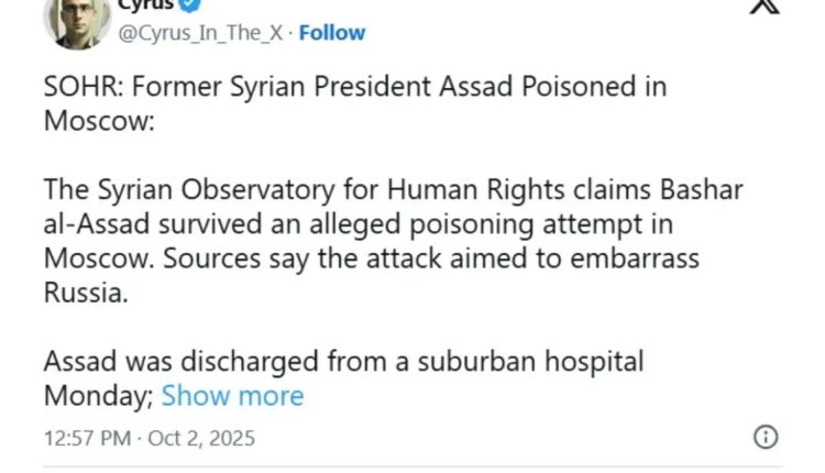 Непотврдени извештаи претходно сугерираа дека Асад бил примен во болница во критична состојба откако бил отруен, објави „Дејли меил“.